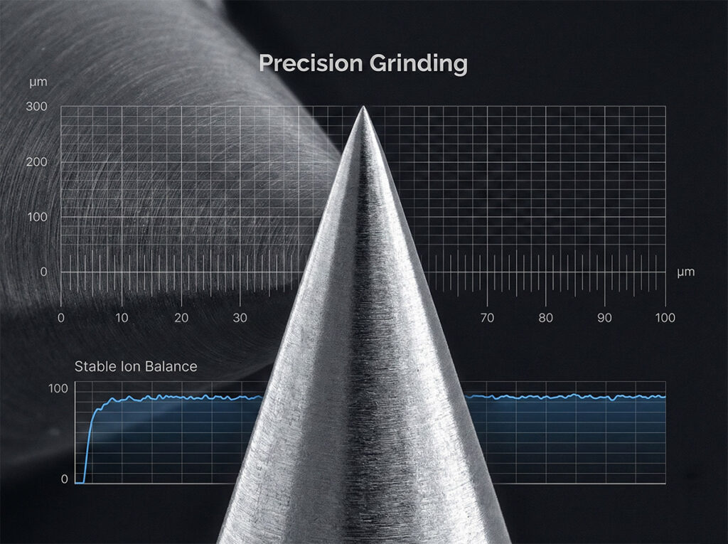 더센텀의 방전침은 일반 스테인리스(SUS) 소재가 아닌 순도 99.99%의 텅스텐(Tungsten)을 사용하여, 고전압 환경에서도 끝부분이 쉽게 뭉뚝해지지 않습니다. 교체 주기를 획기적으로 늘려 유지보수 비용을 절감하고, 공정의 가동률(Uptime)을 높여드립니다.